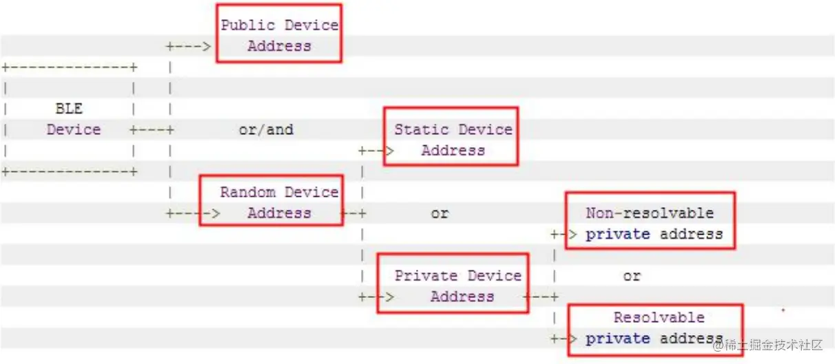 - Resolvable Private Address 不能单独使用,因此需要使用该类型的地址的话,设备要同时具备 Public Device Address 或者 Static Device Address 中的一种。
