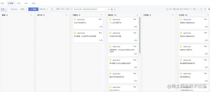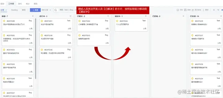 如果团队使用Scrum框架的话,那么在每天的站立会议上,团队在看板上移动需求卡片时,测试人员关注那些已经被开发人员移动到了已解决的卡片,按照实际能力将相应数量的移动到测试中,如下图所示。