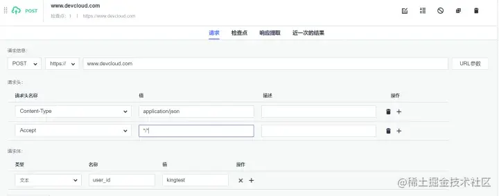 考虑到开发人员不爱做测试的共性,所以回归测试要做成便于开发人员维护,学习、维护成本低,效果好(如上所述的运行速度快、覆盖面广)的特点,比如说接口自动化测试。如下图所示,以软件开发平台 DevCloud 的接口测试为例,配置必要的信息,即为一个场景下的接口测试用例。