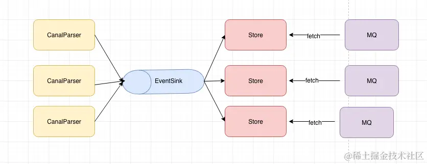 CanalParser产生数据让EventSink进行加工,加工后的数据会存储在CanalEventStore中,然后MQ从CanalEventStore中不断的拉取最新数据,然后投递到MQ。