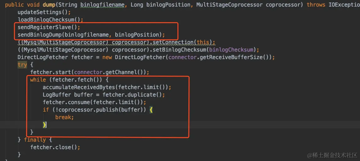 - Step5: 进行dump操作,模拟slave发送注册slave请求,以及dump binlog请求,然后用一个死循环不断的从binlog中拉取数据:
