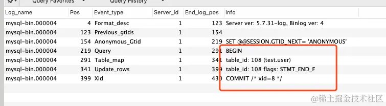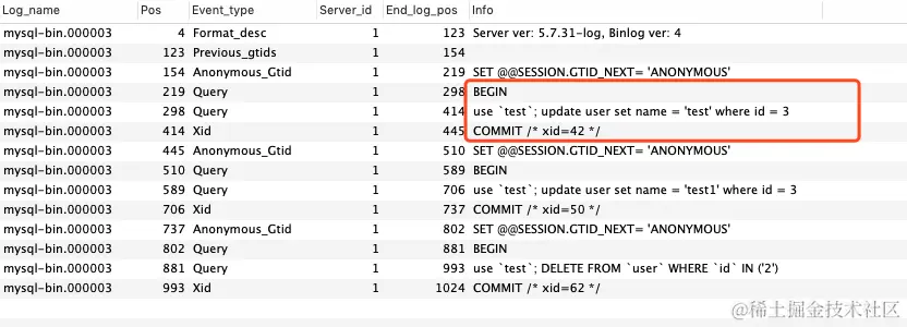 我们可以发现我们所有的操作都会在一个完整的事务中进行,如果事务没有提交是不会出现在我们的binlog当中的,这个大家可以下来进行实验一下,我们在数据库中的更新原始sql都会被完全的记录下来。