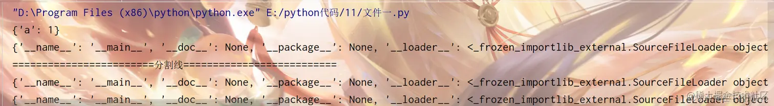 globals():函数会以字典类型返回当前位置的全部全局变量。def func(): a = 1 print(locals()) print(globals()) print('========================分割线==========================') func() print(locals()) print(globals())