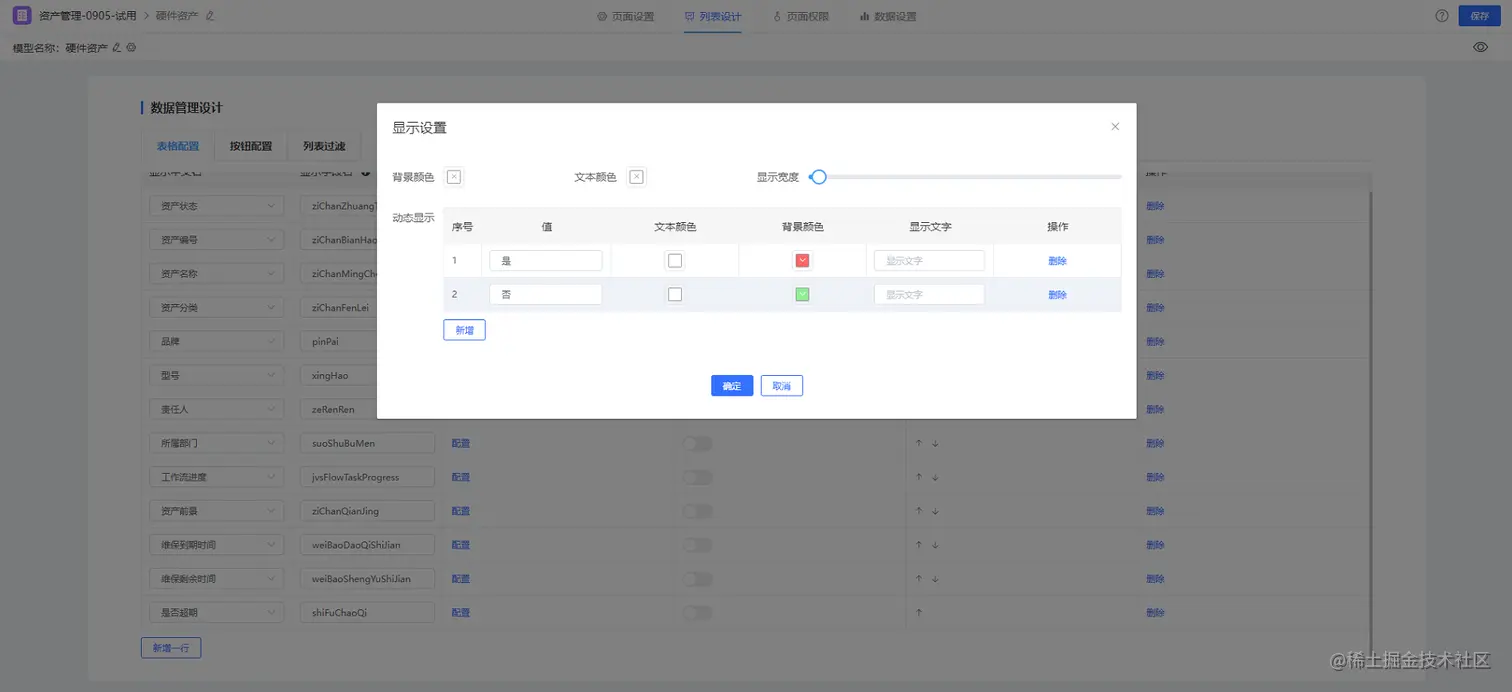 1、配置硬件资产信息的列表页配置对应的剩余时间字段和超期状态 字段,设置字段的颜色显示,如图所示