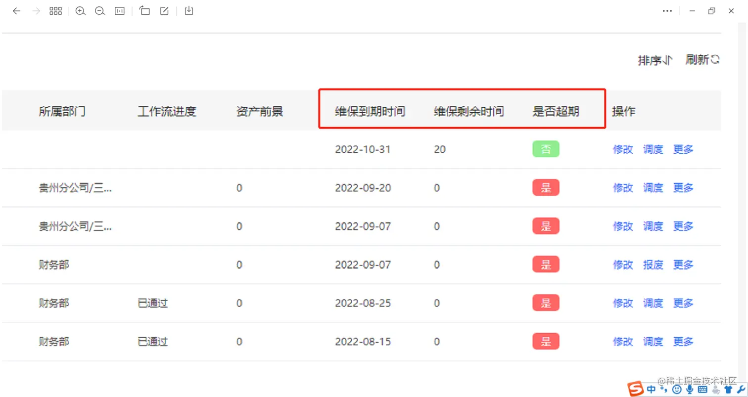 首先,我们分析需求,维保时间=当前时间与到期时间之间的天数, 一旦当前时间超过维保时间,状态为是,且以红色表示。