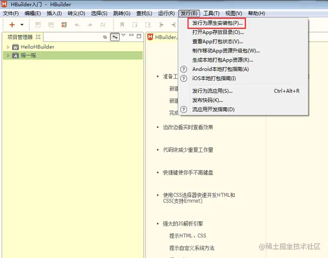 1、打开HBuilder工具,选择完工的项目,点击发行,选择发行为原生安装包。