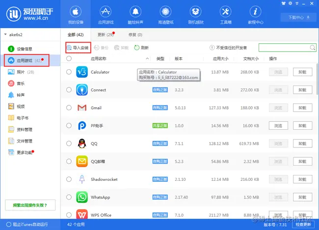 点击应用游戏,点击导入安装,选择刚打包的ipa包。