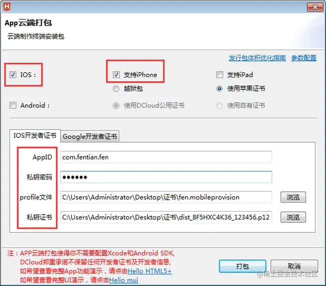 2、选择iOS打包,支持的设备类型,使用苹果证书,填写AppID(刚创建的那个com.fen.tian),