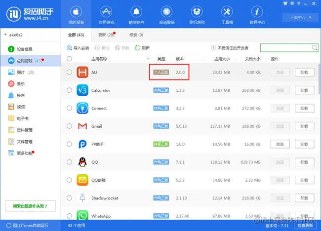 1、下载爱思苹果助手,连接上手机,苹果官方的iTunes助手安装不了,不要用这个。