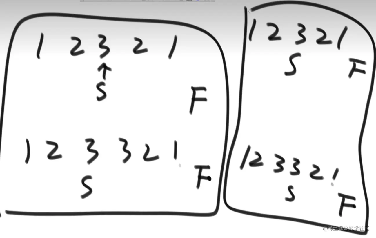 正着念与反着念相同,相当于有一个对称轴,左右成镜像对称 如 1 2 1 实现思路:将链表压进栈里,不断弹出与原来链表比较 可以将对称轴后的东西压进栈里,减少空间 也可以使用一个快指针和一个慢指针,快指针一次走两步,慢指针一次走一步 代码实现