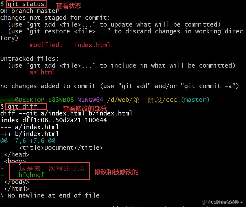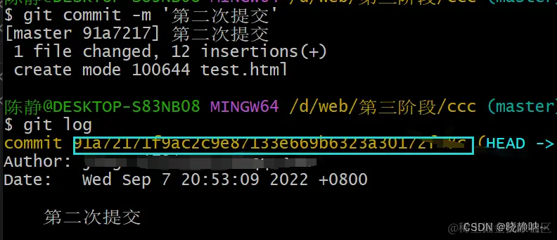 (4)和上面步骤一样在新建一个 test.html,然后提交test.html,然后输入 git log 查看结果