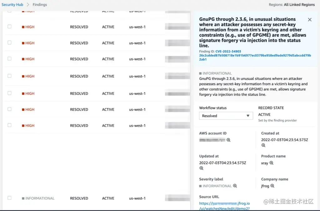 您将立即在 Amazon Security Hub 中获得 JFrog 扩展漏洞数据的价值。您还将有一个返回 Xray 的现成链接,在那里您可以更深入地挖掘 JFrog 增强的有关该问题的情报,其中上下文分析可以让您知道漏洞是否存在真正的风险,从而节省您的时间。