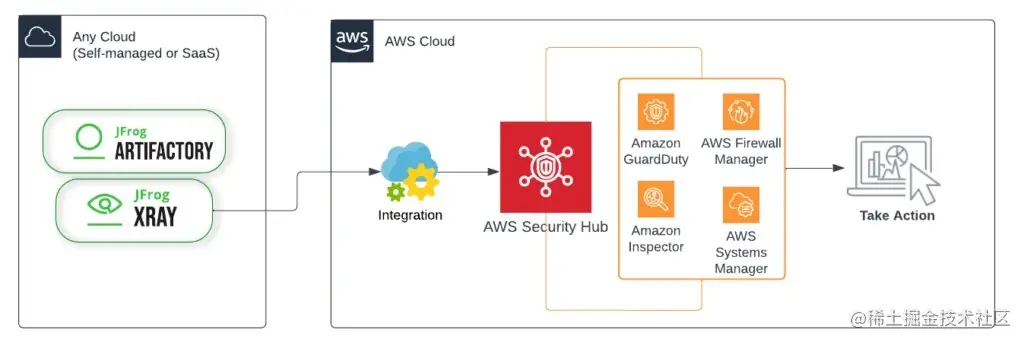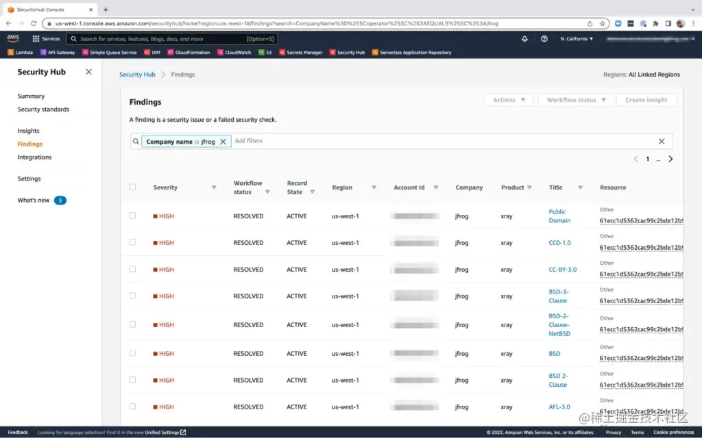 无论您的 JFrog 平台部署在何处运行(无论是在亚马逊云科技上还是其他基础设施上),以及来自 SaaS 、云服务或私有部署,您都可以将 Xray 与 Amazon Security Hub 集成。因此,即使您的生产存储库托管在其他地方,您也可以在 Amazon Security Hub 中查看来自 Xray 的警报。