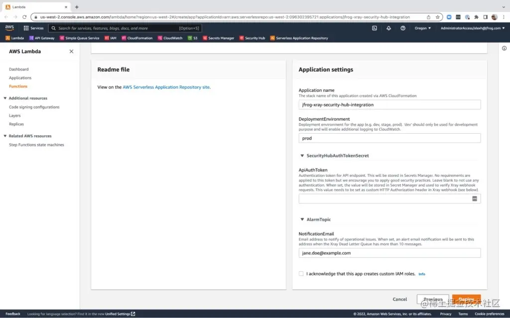 为方便起见,集成已发布到 Amazon Serverless Application Repository。当您将集成部署到您的亚马逊云科技账户时,您必须输入应用程序设置(部署环境、API 身份验证令牌等)来配置集成。