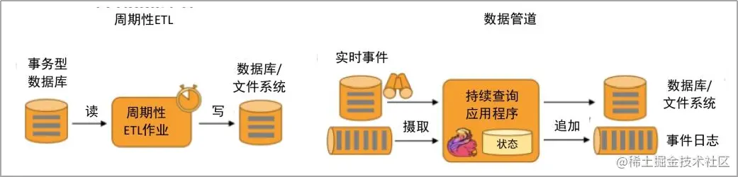 数据管道的主要应用实例有电子商务中的实时查询索引构建、持续 ETL 等。周期性 ETL 作业和持续数据管道的对比如下图所示。