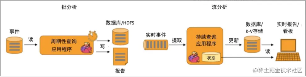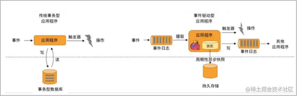 传统应用和事件驱动型应用架构的区别如下图所示。