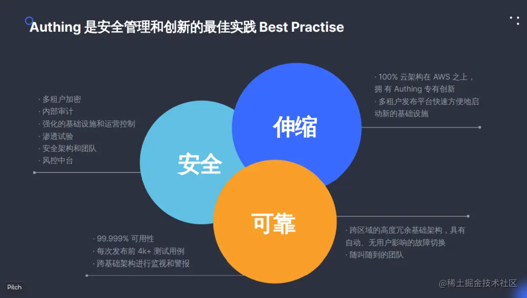 在安全方面,Authing 采用多租户加密、内部审计、强化的基础设施和运营控制、渗透试验、安全架构和团队和风控中台,打造值得客户信赖的服务;在伸缩方面,Authing 100% 云架构在 AWS 之上,拥有 Authing 专有创新;多租户发布平台快速方便地启动新的基础设施;在可靠性方面,Authing 已达到 99.999% 可用性,每次发布前 4k+ 测试用例,跨基础架构进行监视和警报,具有自动、无用户影响的故障切换。
