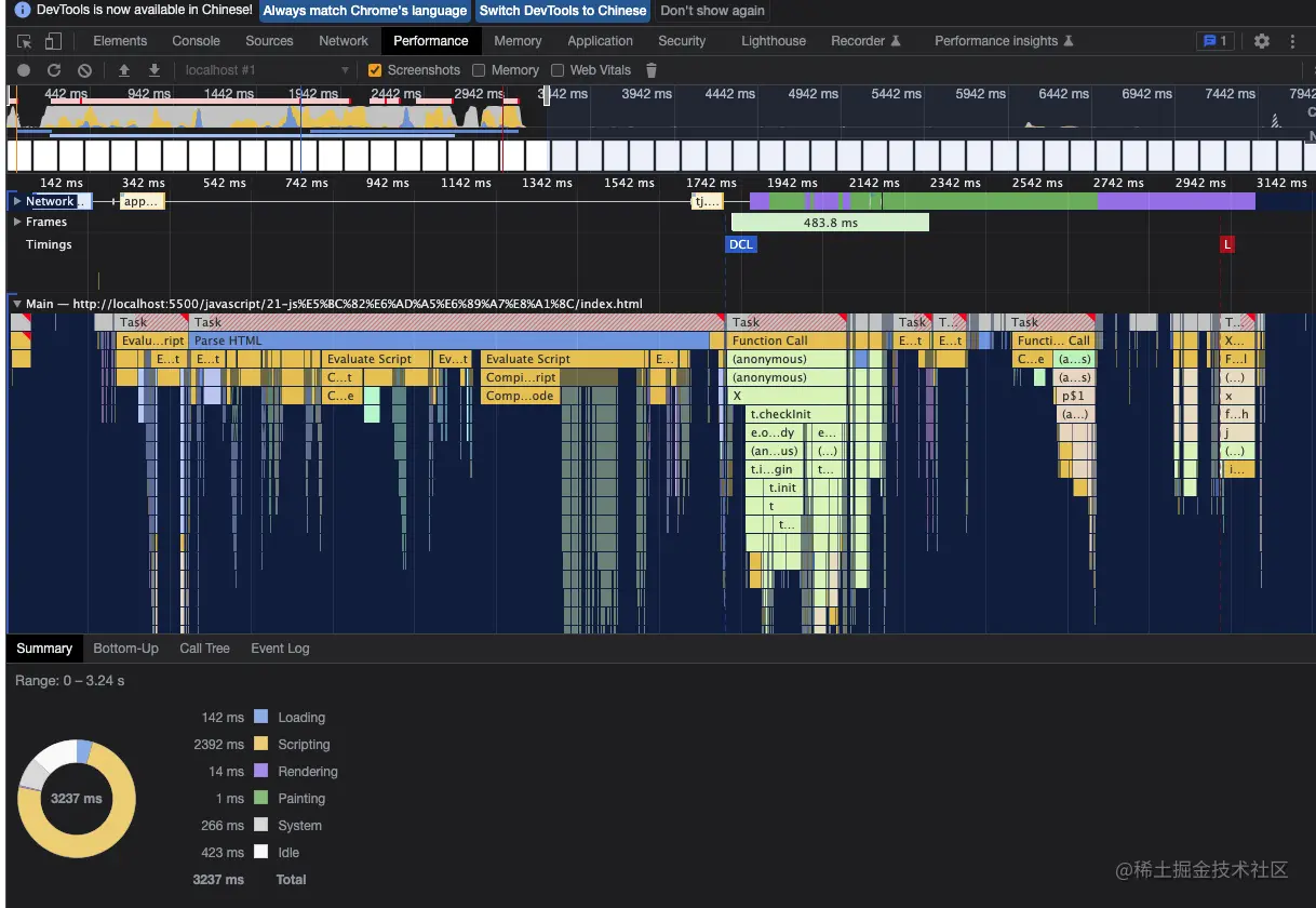 当我们用浏览器的Performance去比较两组数据时,我们会发现总长时间,使用定时器的性能大概比没有使用定时器的性能时间上大概要少50%,在summary中所有数据均有显著的提升。