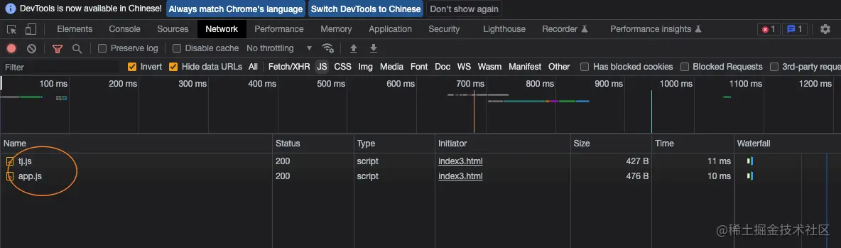 首先肯定是加载顺序会发生变化,会先加载tj.js然后再加载业务app.js,你会发现同步加载这种方式有个弊端,假设tj.js很大,那么是会阻塞影响页面首屏打开速度的,所以在之前采用异步,定时器方式,首屏加载会有显著提升。