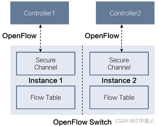 一个OpenFlow交换机可以有若干个OpenFlow实例,每个OpenFlow实例可以单独连接控制器,相当于一台独立的交换机,根据控制器下发的流表项指导流量转发。OpenFlow实例使得一个OpenFlow交换机同时被多组控制器控制成为可能。