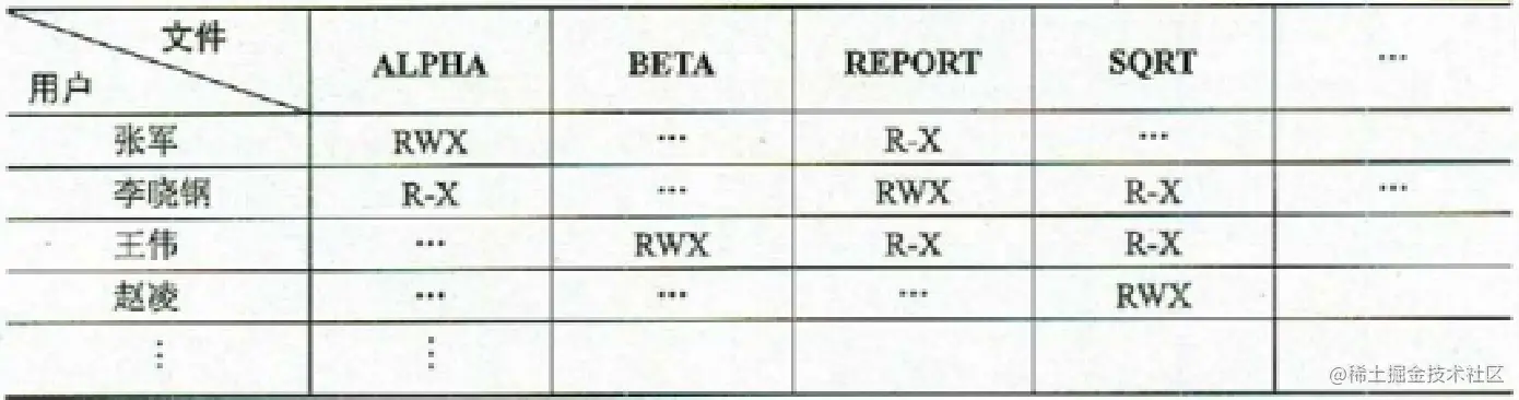 存取控制矩阵在概念上是简单清楚的,但实现上却有困难。当一个系统用户数和文件数很大时,二维矩阵要占很大的存储空间,验证过程也将耗费许多系统时间。