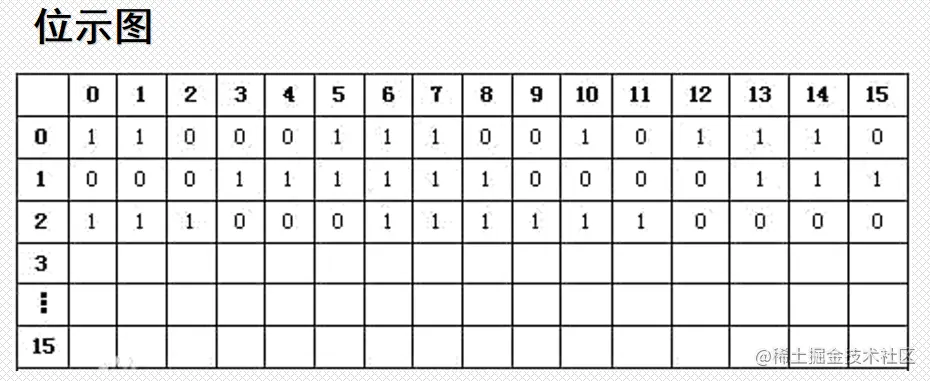 (2)位示图:这种方法是在外存上建立一张位示图(bitmap),记录文件存储器的使用情况。每一位对应文件存储器上的一个物理块,取值0和1分别表示空闲和占用。文件存储器上的物理块依次编号为0,1,2,……。假如系统中字长为32位,那么在位示图中的第一个字对应的文件存储器上的0,1,2,……,31号物理块;第二个字对应文件存储器上的32,33,34,……,63号物理块,依次类推。