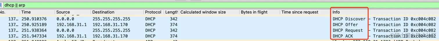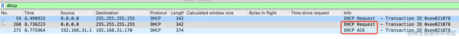 其实只发生了DHCP的第三和第四阶段。这是因为机子记录了曾经使用过 192.168.31.170这个IP,重新联网后,会优先再次请求这个IP,这样就省下了第一第二阶段的广播了。