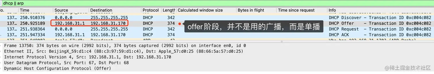 另外一个小细节不知道大家注意到没,上面在提到 DHCP Offer 阶段时,提到的是DHCP服务器会使用广播的形式回复。但抓个包下来却发现并不是广播,而是单播。