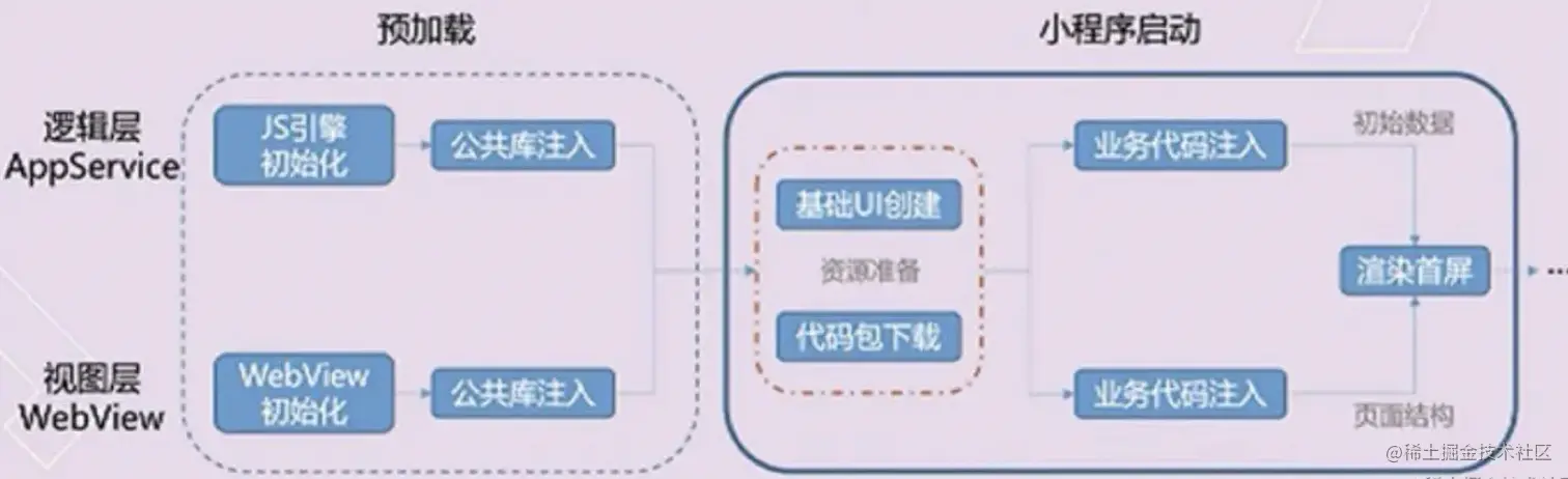 围绕上图小程序的启动流程, 我们可以从加载、渲染两个纬度进行切入:
