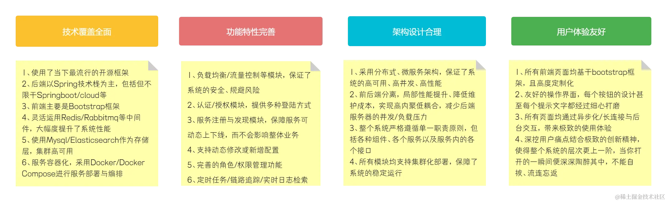 当然,它的强大与全面不是一两句话就能说得清的,即使通过本文我也未必能把它清清楚楚的呈现在大家面前,感兴趣的老铁还是需要花点时间去研究一下它的源码。简单总结就是:功能特性完善、技术覆盖全面、架构设计合理、用户体验友好。