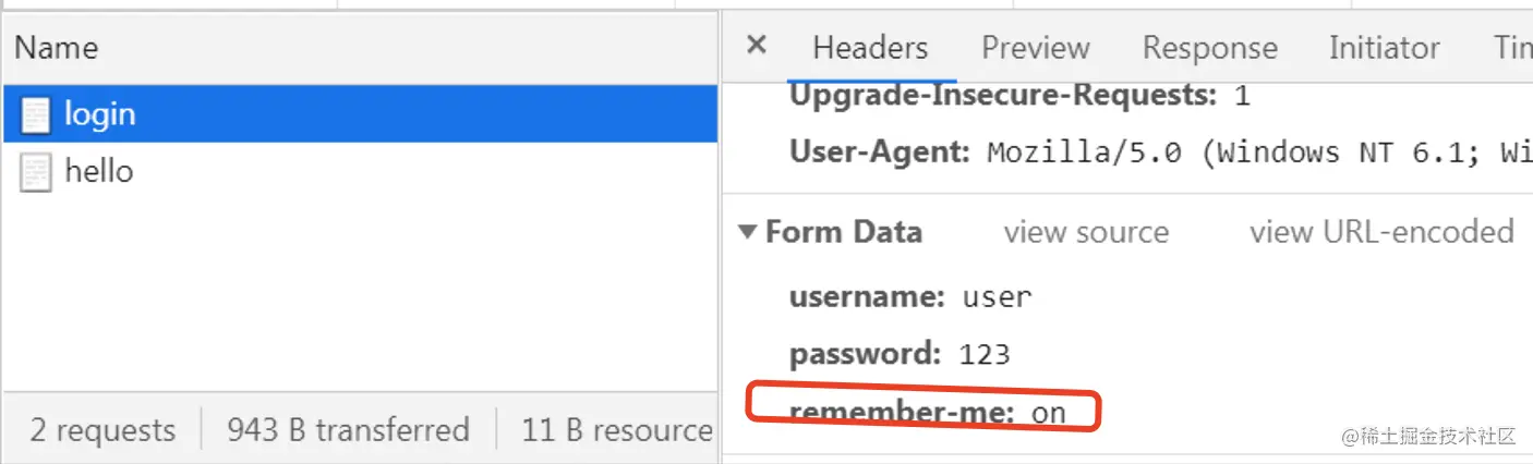 此时如果我们打开 开发者调试工具,并且勾选“记住我”,然后发起请求,这时候我们会在控制台看到remember-me的cookie信息,说明Spring Security已经自动生成了remember-me这个cookie,且表单中的remember-me参数也处于了“on”状态。