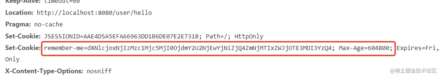 - 在浏览器关闭并重新打开之后,用户再去访问 /user/hello 接口时,此时就会携带remember-me这个cookie到服务端;