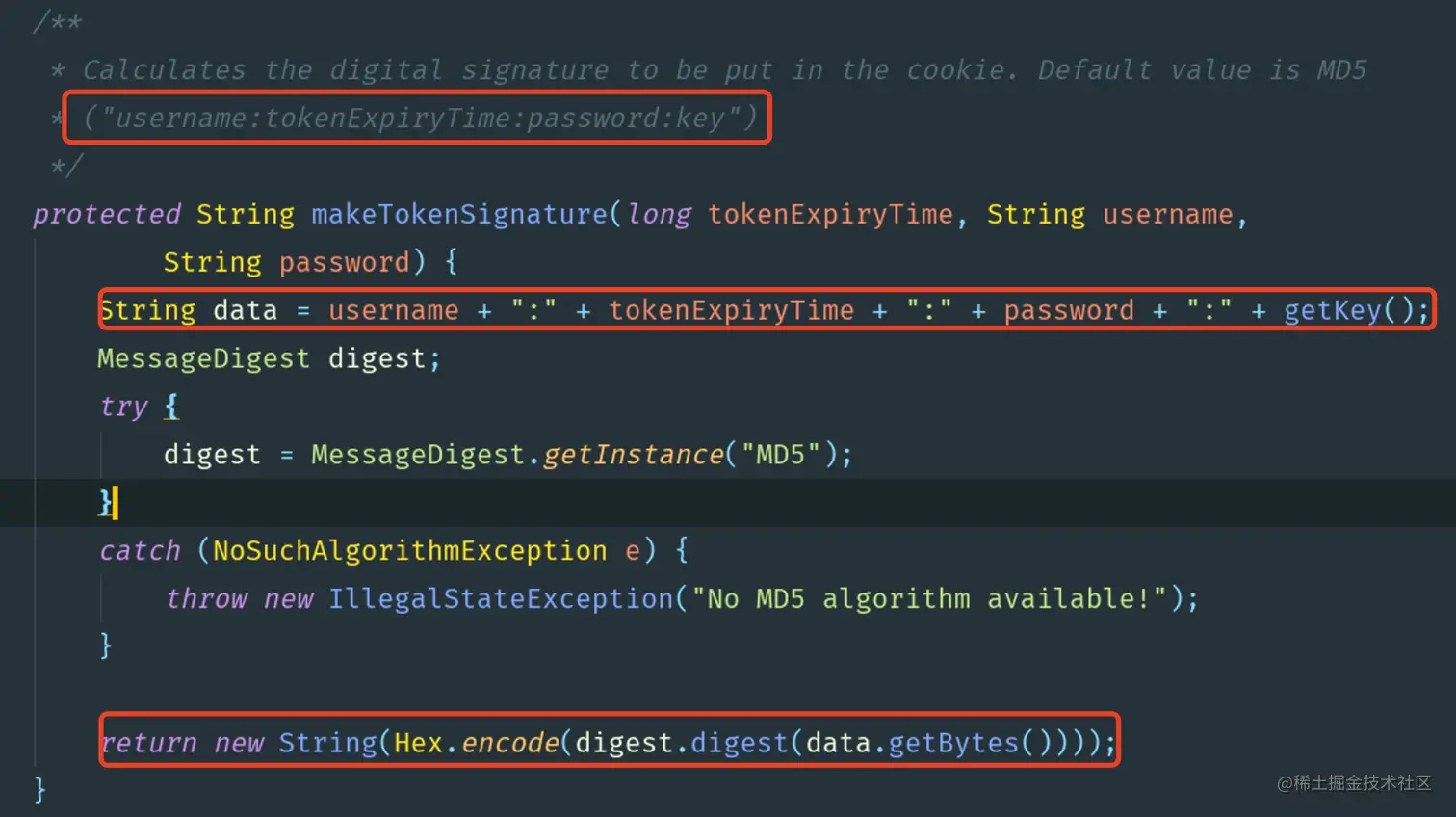然后 壹哥 带你看看TokenBasedRememberMeServices源码类中的makeTokenSignature()方法, 你会看到散列加密算法的具体加密实现过程,源码如下图所示: