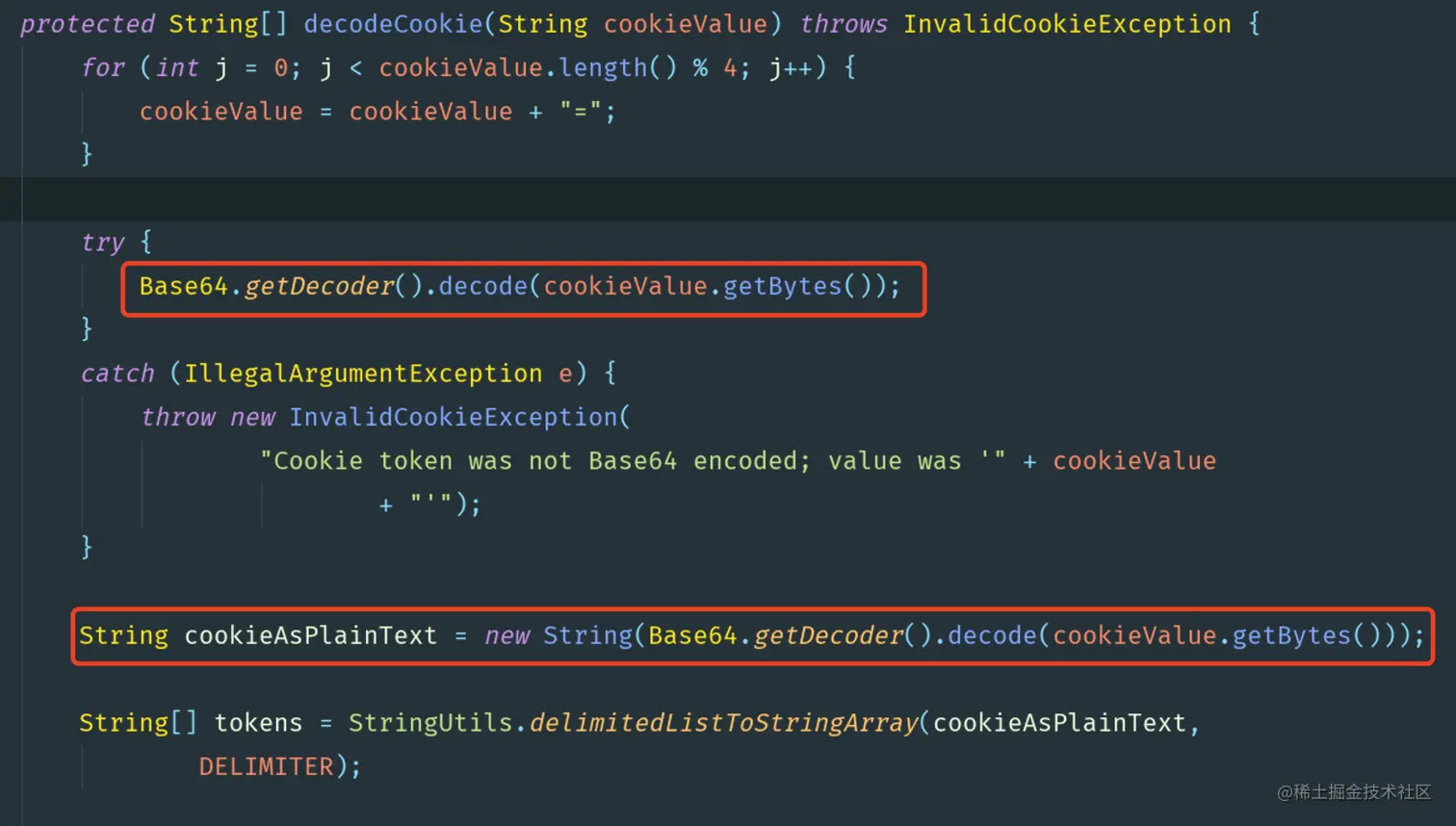 Spring Security是在AbstractRememberMeServices类的decodeCookie()方法中,利用Base64对cookie进行解码,如下图所示: