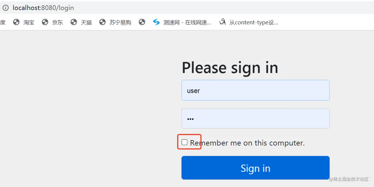 然后我们把项目启动起来进行测试,当然你别忘了编写项目入口类,这里我就不粘贴相关代码了。 我们访问一下/user/hello接口,会先重定向到/login接口,这时候会发现在默认的登录页面上多了一个“记住我”功能。