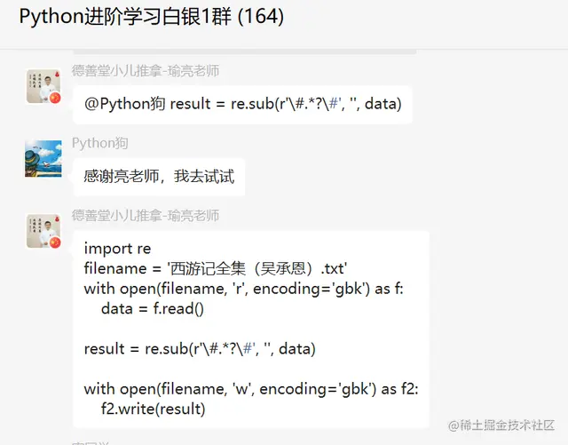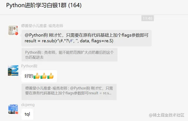 最后感谢粉丝【Python狗】提问,感谢【瑜亮老师】给出的思路和代码解析,感谢【dcpeng】等人参与学习交流。
