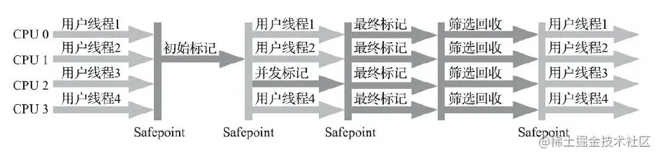 - 3 最终标记 对用户线程做一个短暂的停顿,用于处理并发阶段结束后仍遗留下来的 STAB 记录。