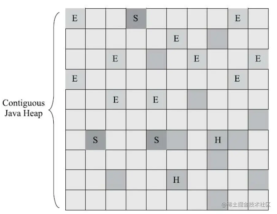 虽然 G1 保留了新生代和老年代的概念,但是其空间已经不是固定的了,G1 垃圾回收器将 Region 作为垃圾回收器的最小单元,建立起了可以预测的 STW 时间模型,这样就可以避免整个 java 堆的全区域垃圾回收,Garbage First 即是以垃圾为第一目标,优先处理回收价值最大的区域 ,这就是 G1 的名称由来。下图即是垃圾回收器的 Region 分区示意图: