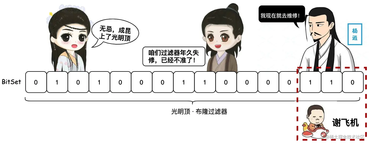 - 张无忌:布隆过滤器的长度太小,哈希计算单一。导致谢飞机、拎瓢冲、成昆,三个人的哈希值都是相同的,所以没法判断成昆是否上了光明顶。咱们只能快些上山了,沿途小心。