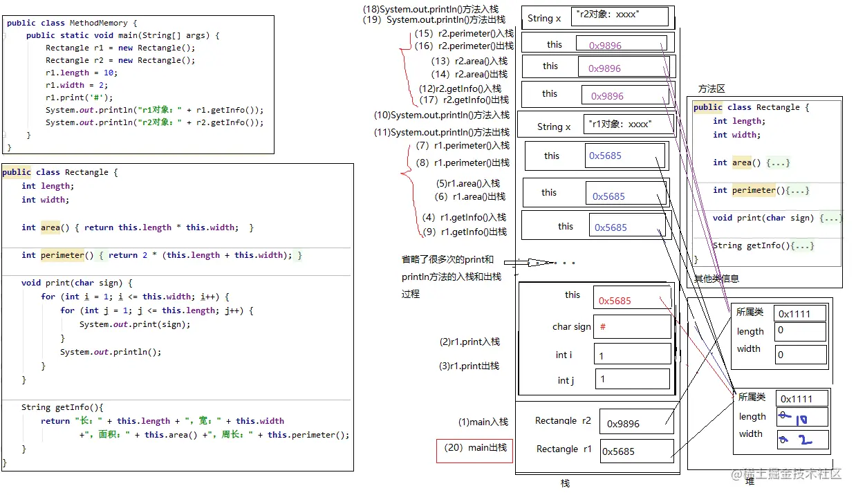 方法不调用不执行,调用一次执行一次,每次调用会在栈中有一个入栈动作,即给当前方法开辟一块独立的内存区域,用于存储当前方法的局部变量的值
