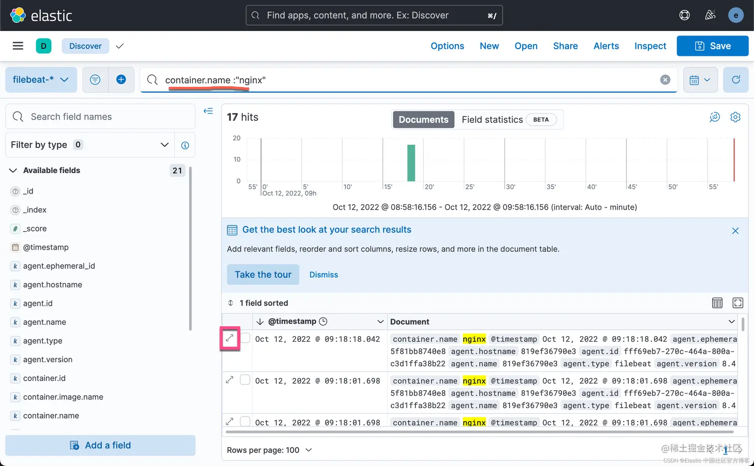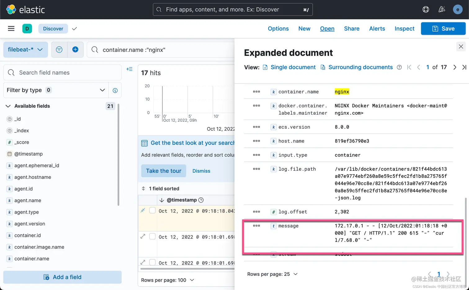 我们接下来去 Kibana 中查看我们在 Ubuntu OS 中的容器 filebeat 及 nginx 的日志信息: