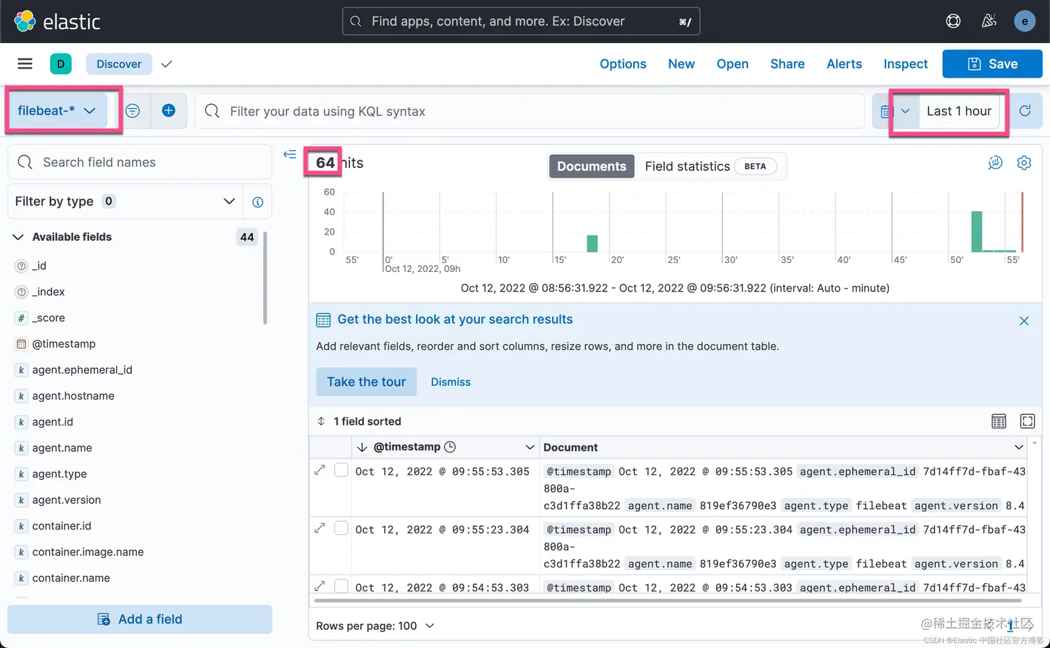 在上面,我们可以看到共有 64 个日志信息。我们可以通过搜索来分别查看 nginx 和 filebeat 的日志: