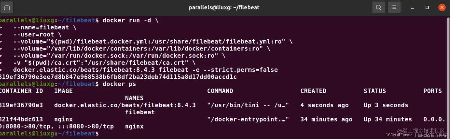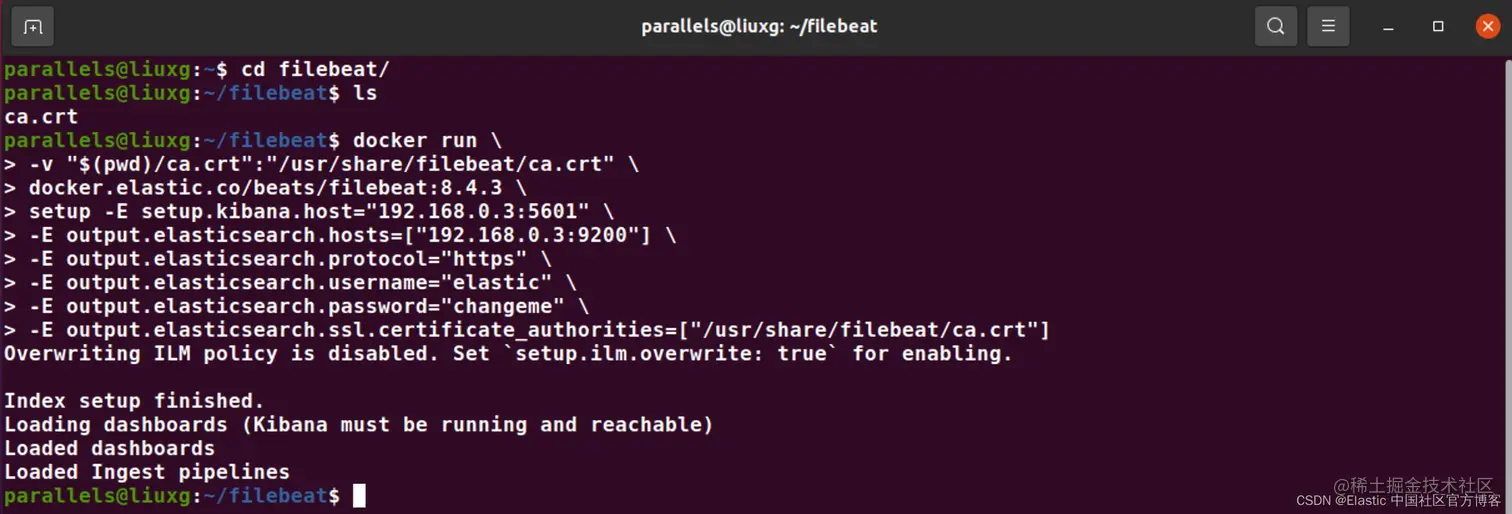 我们可以使用 scp 命令把上面的 ca.crt 文件拷贝到 Ubunut OS 机器的一个目录中,比如 /home/parallels/filebeat: