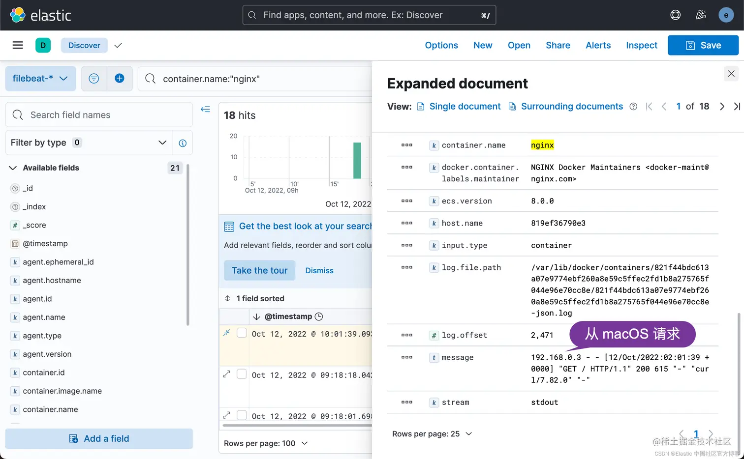 上面的命令将为 nginx 容器生成一个日志。我捎等一会儿,再到 Kibana 中进行查看: