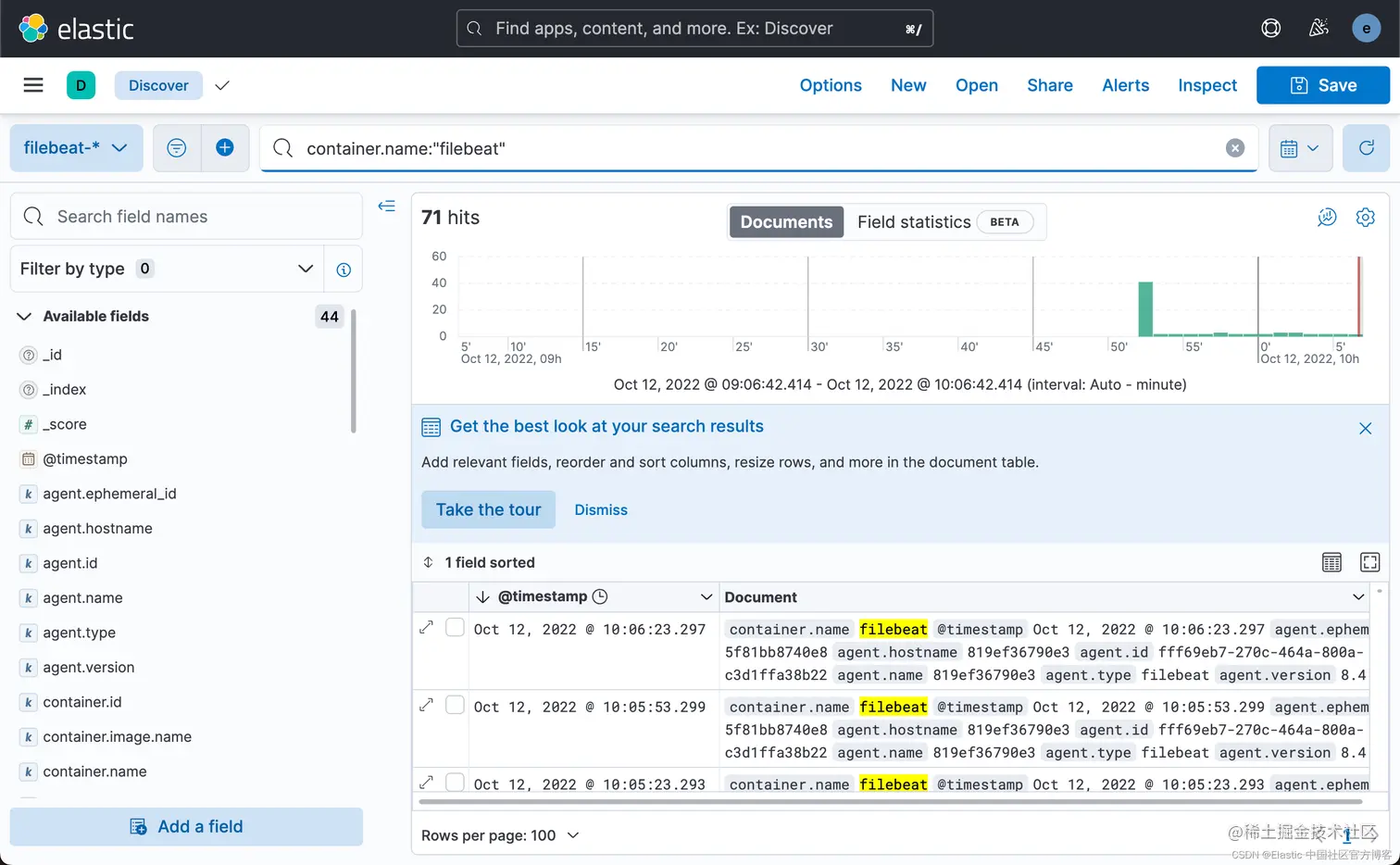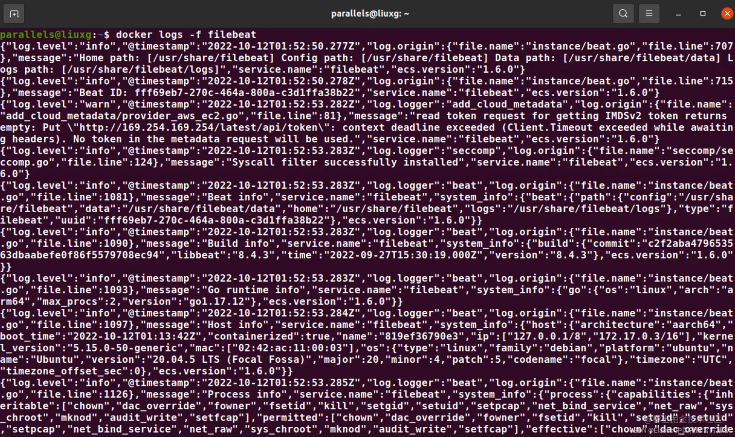 同样地,我们可以查看从 filebeat 容器发出的日志: