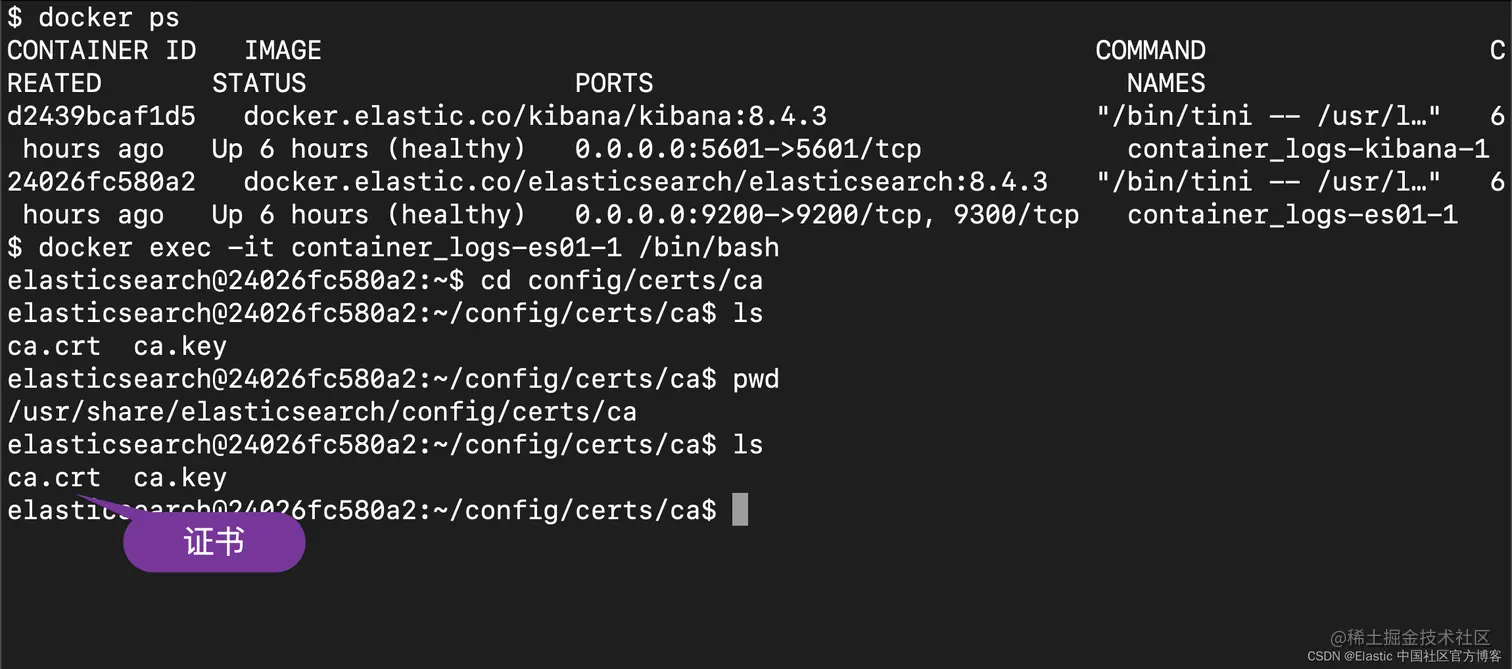 3. $ docker cp container_logs-es01-1:/usr/share/elasticsearch/config/certs/ca/ca.crt .
