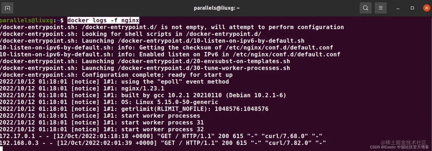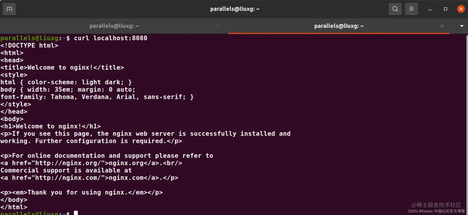 我们接下来在 Ubuntu OS 上使用 docker 来安装 Nginx。如果你在 Ubuntu OS 上还没有安装好 docker,你可以参考链接 How to install Docker on Ubuntu 22.04 | 20.04 - Tutorials and How To - CloudCone 来进行安装。我们运行如下的命令安装 Nginx: