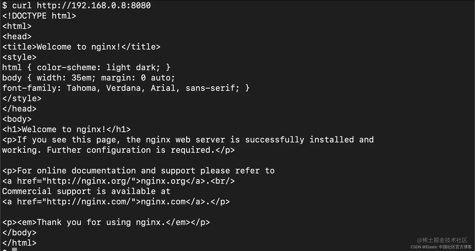 我们可以使用上面的命令 curl localhost:8080 来访问 web 服务器。我们可以在 Nginx 的屏幕上看一个多出来的日志: