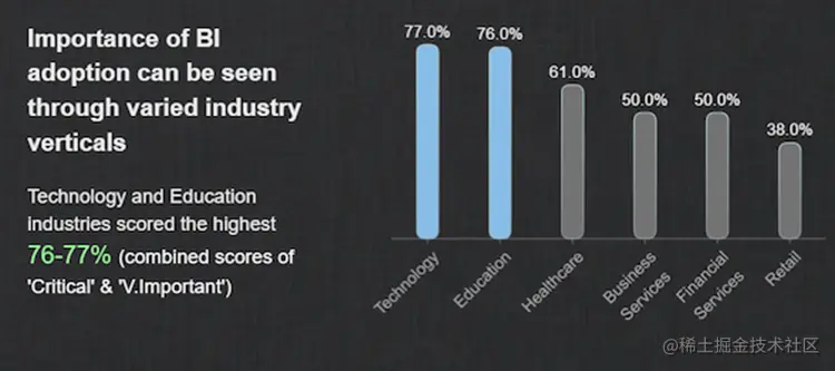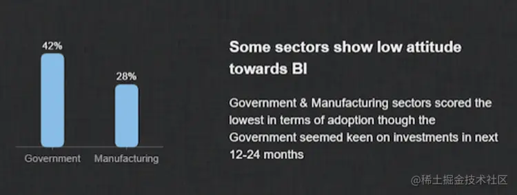 另一方面,政府(42%)和制造业(28%)在采用率方面得分最低。这些数字可能是由于各种原因造成的,但政府的一个明显原因是数据的敏感性。在搜索 BI 系统时,找到具有可扩展安全性的系统至关重要,这样IT 团队就可以轻松管理角色、权限、许可证、用户和安全性。