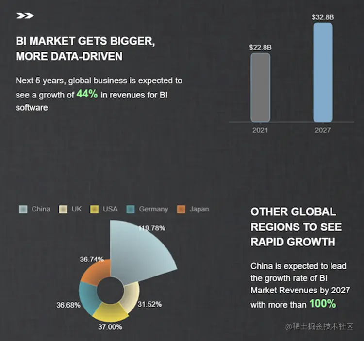 2021 年,BI 软件市场规模在全球范围内的收入为 228 亿美元。预计 2027 年将增长 44%,收入预计将达到 328 亿美元。到 2027 年,中国的增长率最高达到 119.8%,其次是美国(37%),紧随其后的是德国和日36.7%,然后是英国(31.5%)。
